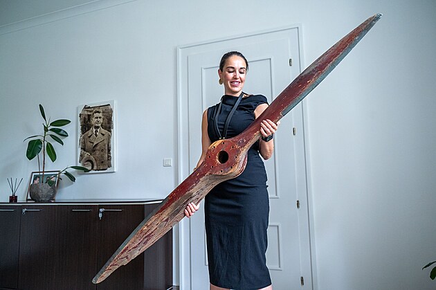 Ředitelka Nadace Tomáše Bati Gabriela Končitíková s údajnou vrtulí z letadla Junkres F.13, ve kterém zahynul v roce 1932 továrník Tomáš Baťa a pilot Jindřich Brouček. Vrtule je však novější, byla vyrobena po 2. světové válce v Otrokovicích.