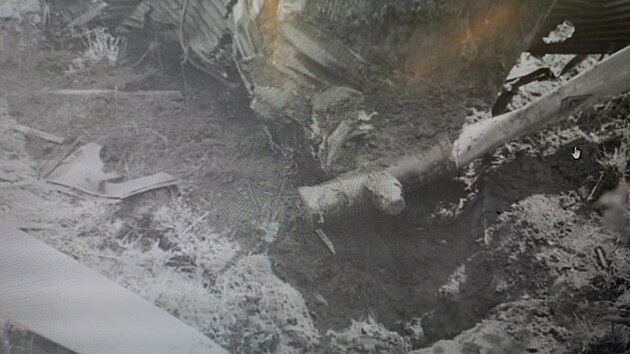 Trosky letadla, v němž zahynul továrník Tomáš Baťa a pilot Jindřich Brouček. Detail vrtule (červenec 1932)