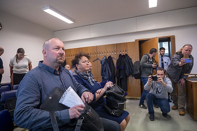 Velitel hasičů Jiří Pochyla a pracovnice odboru životního prostředí rožnovské radnice Věra Šulová před okresním soudem ve Vsetíně. (10. dubna 2024)