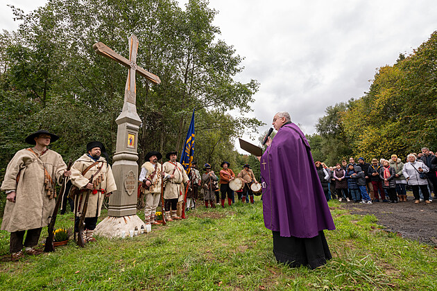 Místo hromadného hrobu valašských obránců označuje dřevěný kříž. (5. říjen 2025)