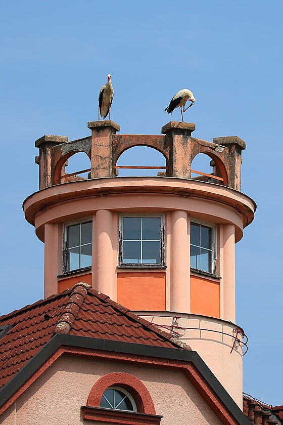 Párek čápů bílých na věžičce domu v centru Zlína (duben 2025)