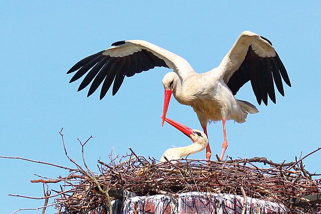 Čápi bílí na komíně zahradnictví v centru Zlína (duben 2025)