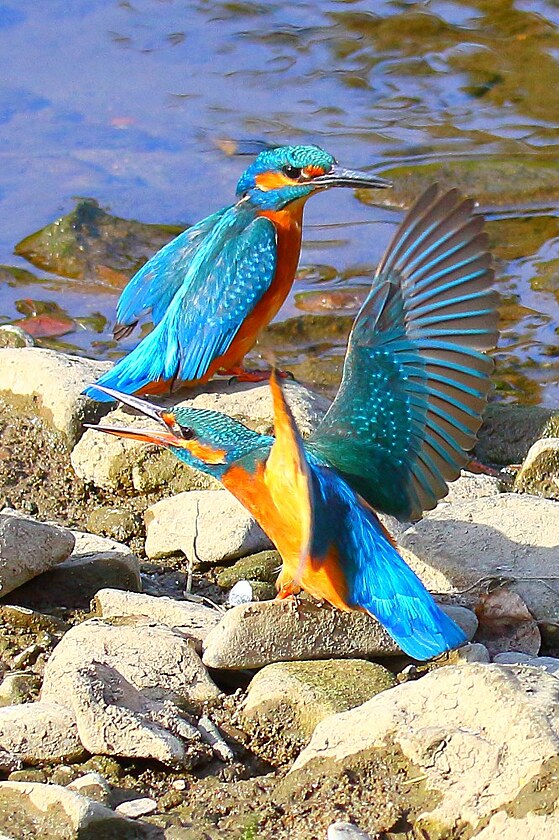 Ledňáčci říční u řeky Dřevnice v centru Zlína (duben 2025)