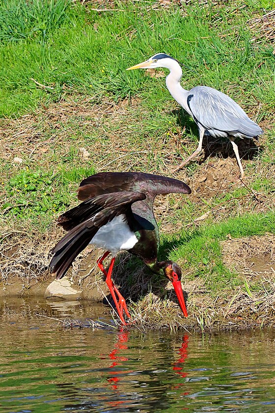 Volavka popelavá a čáp černý u řeky Dřevnice v centru Zlína (jaro 2024)