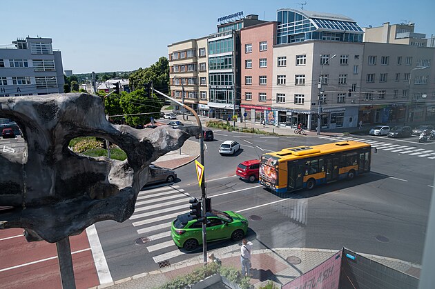 Křižovatka ulic Dlouhá a třída Tomáše Bati ve Zlíně s plastikou Letící múza na budově divadla (červen 2025)