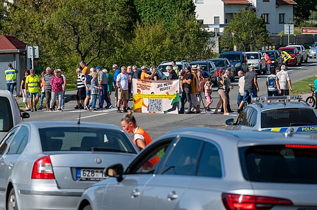 Lidé v Horním Lapači zablokovali silnici, žádali dostavbu D49. Na místě se tvořily dlouhé kolony aut. (září 2025)