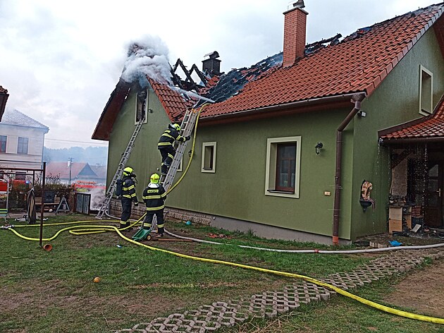 Ve Vysokém Poli hořel rodinný dům. Ženu s malým dítětem vyvedl ven soused. Událost se obešla bez zranění. (duben 2025)