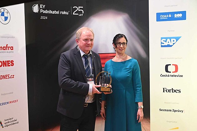 Antonín Machala s vedoucí partnerkou EY Martinou Kneiflovou při vítězství v krajské soutěži EY Podnikatel roku 2024 ve Zlínském kraji. (20. února 2025)