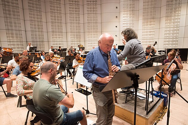 Felix Slováček a Felix jr. se zlínskou filharmonií před společným koncertem. Doplnila je i Slováčkova dcera Anna. (2022)