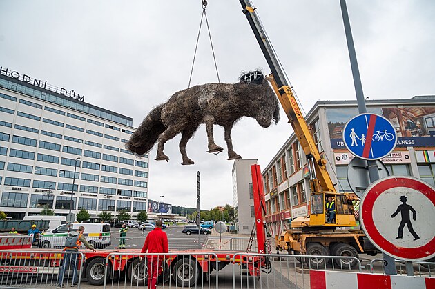 Instalace objektu Vulpes Gott autora Františka Skály na náměstí Práce ve Zlíně. Je součástí výstavy Němá tvář: Člověk a pes v současném českém výtvarném umění. (září 2025)