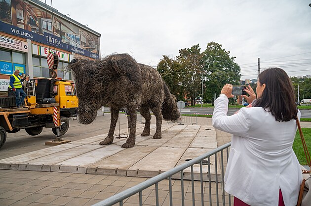 Instalace objektu Vulpes Gott autora Františka Skály na náměstí Práce ve Zlíně. Je součástí výstavy Němá tvář: Člověk a pes v současném českém výtvarném umění. (září 2025)