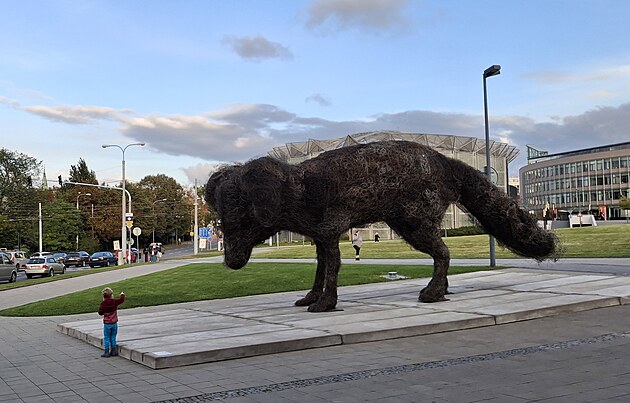 Drátěná socha psa od Františka Skály budí ve Zlíně emoce. Děti si ji oblíbily.