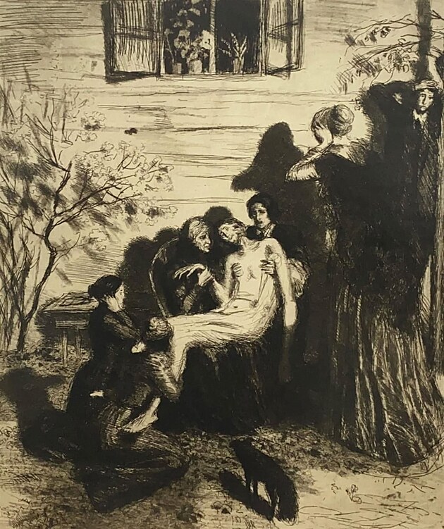 Grafika Pieta malíře Maxe Švabinského, která inspirovala dílo Františka Skály. Z odstrkovaného psíka udělal hlavního hrdinu.