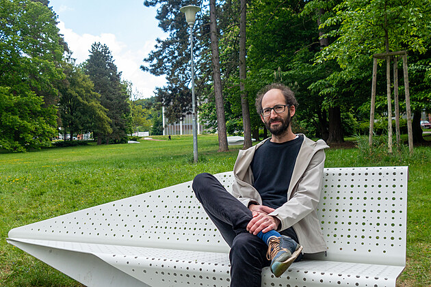 Zlínský architekt Jan Pavézka u lavičky na Gahurově prospektu, kterou navrhl. (květen 2025)