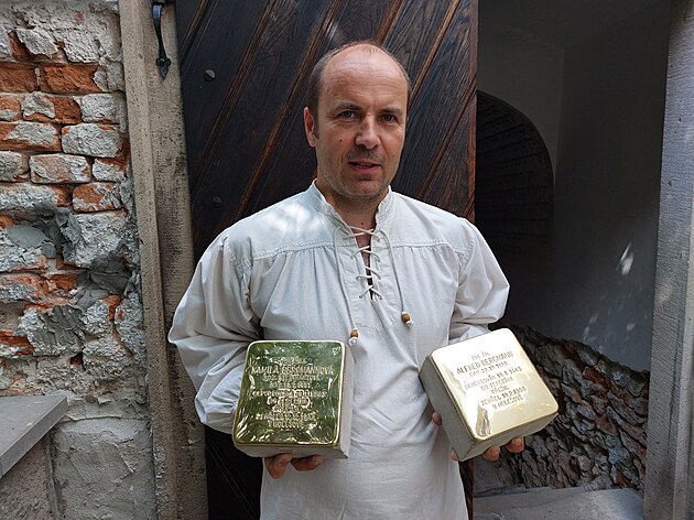 Před Šachovou synagogu v Holešově umístili takzvané kameny zmizelých. Připomínají osudy židovských obyvatel. Na snímku správce synagogy Vratislav Brázdil (červenec 2023)