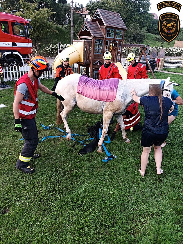 Hasiči z centrální hasičské stanice Zlín zachraňovali koně, který spadl do bazénu. (srpen 2025)