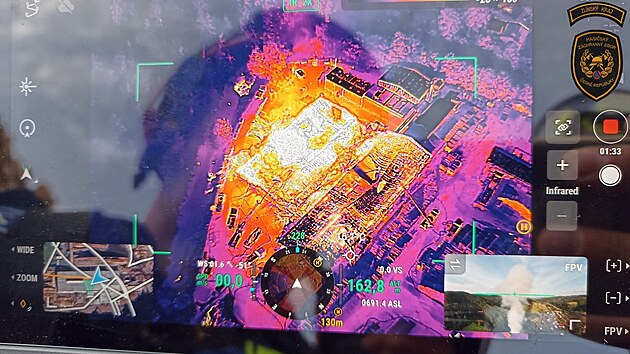 Hasiči likvidují požár pily ve Velkých Karlovicích na Vsetínsku. Místo požáru zachycené dronem s termokamerou. (17. června 2025)