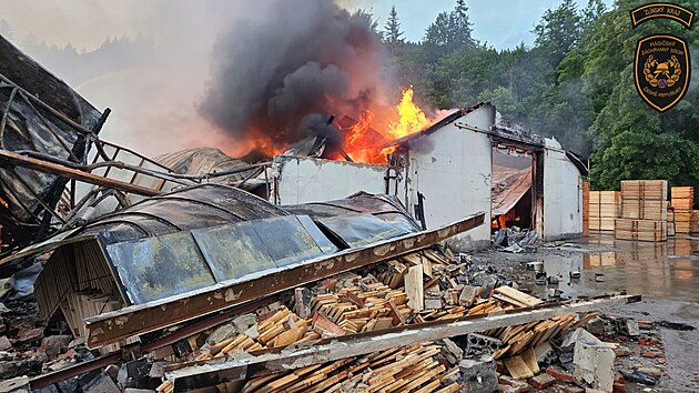Hasiči likvidují požár pily ve Velkých Karlovicích na Vsetínsku. (17. června 2025)