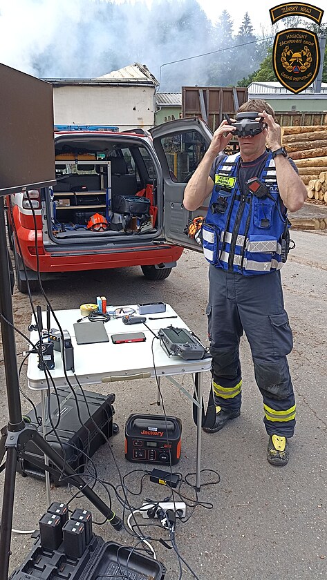 Požár pily ve Velkých Karlovicích, hasič řídí dron. (17. červen 2025)