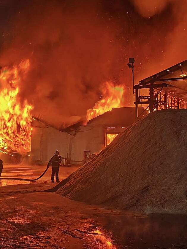 Hasiči bojují s požárem pily ve Velkých Karlovicích na Vsetínsku. (17. června 2025)