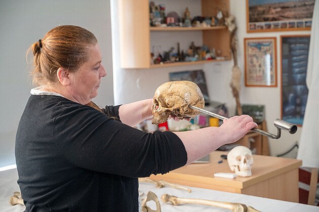 Žáci ZŠ UNESCO v Uherském Hradišti dokončili projekt, při kterém spolu s výzkumníky z Brna identifikovali kostru používanou v hodinách. Patřila husarovi z rakousko-uherské armády. Na snímku vedoucí výzkumu - odborná asistentka fyziologického ústavu Lékařské fakulty Masarykovy univerzity v Brně Miriam Nývltová Fišáková. (duben 2025)