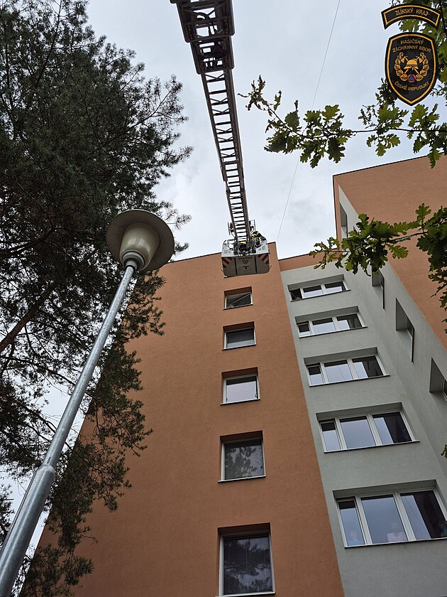 Hasiči pomocí výsuvné plošiny zachránili nemohoucí ženu v ulici Budovatelská ve Zlíně. (15. září 2025)