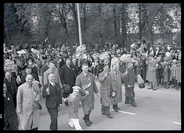 Čestné přední místo v prvomájovém průvodu příslušelo baťovské ředitelně. V první řadě zleva: Stanislav Landa, Dominik Čipera, Jan Baťa mladší, Jan Antonín Baťa, Josef Hlavnička, Hugo Vavrečka, Josef Blažek. (1937)