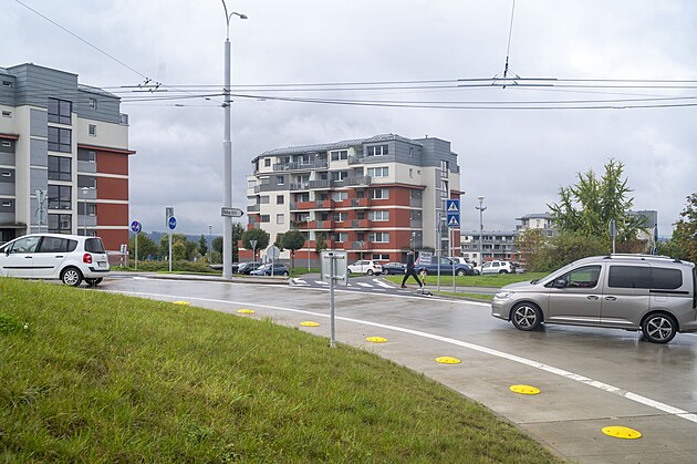 V ulici Zelinova na Jižních Svazích ve Zlíně dostavěli nový výjezd z okružní křižovatky. (říjen 2024)