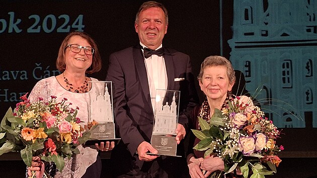Knihovnice Miroslava Čápová (vpravo) a Hana Hanáčková dostaly od starosty Stanislava Blahy Cenu města Uherské Hradiště. (17. říjen 2025)
