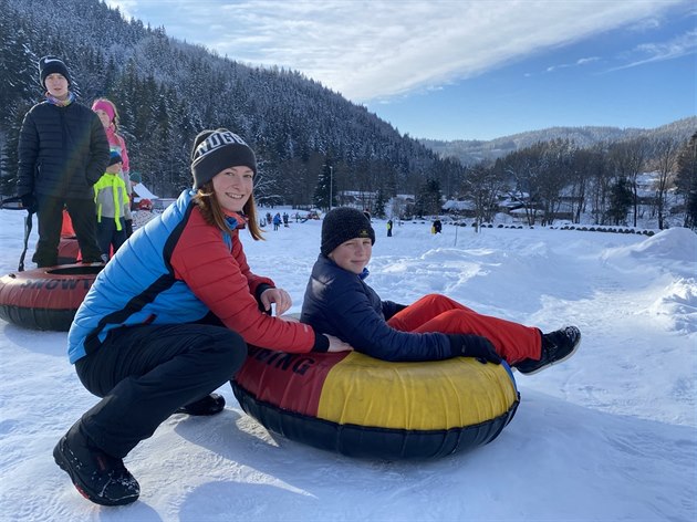 Ve Velkých Karlovicích je oblíbený takzvaný snowtubing – tedy jízda ve zasněženém korytu na gumových člunech.