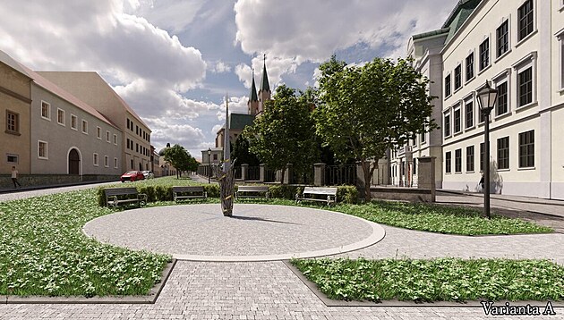 Vizualizace budoucí podoby památníku díla biskupa Karla na Sněmovním náměstí před Arcibiskupským zámkem v Kroměříži (září 2024)
