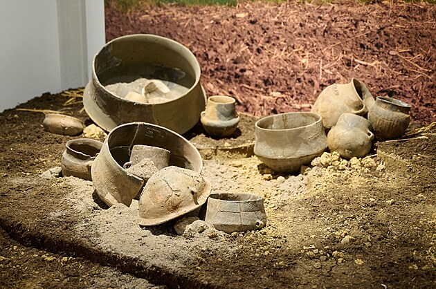 Výstava Hradisko u Kroměříže - pevnost z doby bronzové v Muzeu Kroměřížska. Na snímku ukázka z pohřebnictví. (říjen 2024)