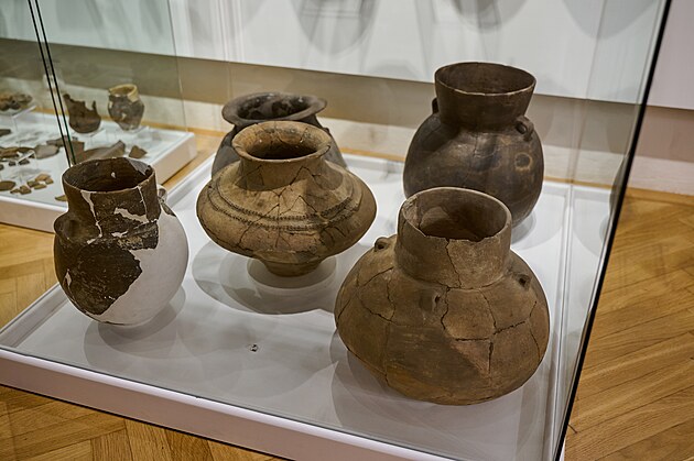Výstava Hradisko u Kroměříže - pevnost z doby bronzové v Muzeu Kroměřížska. Na snímku typická keramika věteřovské kultury ze starší doby bronzové - 1. pol. 2. tisíciletí př.n.l. (říjen 2024)