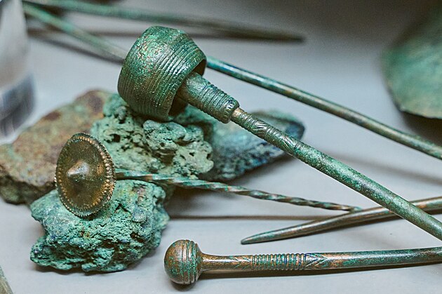 Výstava Hradisko u Kroměříže - pevnost z doby bronzové v Muzeu Kroměřížska. Na snímku poklad z depotu Hradisko 3 (14.-13. stol. př.n.l.) (říjen 2024)