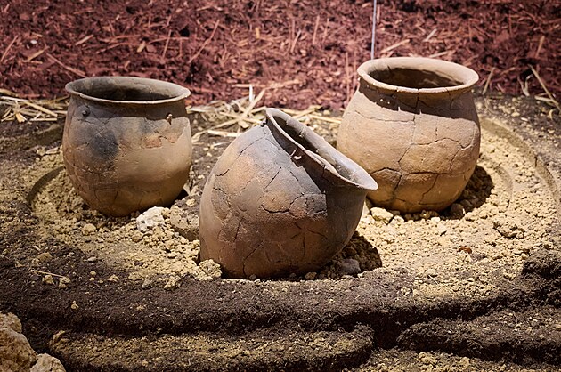 Výstava Hradisko u Kroměříže - pevnost z doby bronzové v Muzeu Kroměřížska. Na snímku ukázka z pohřebnictví. (říjen 2024)