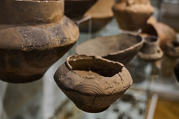 Výstava Hradisko u Kroměříže - pevnost z doby bronzové v Muzeu Kroměřížska. Na snímku typická keramika mladší doby bronzové (1300-1000 př.n.l.). (říjen 2024)