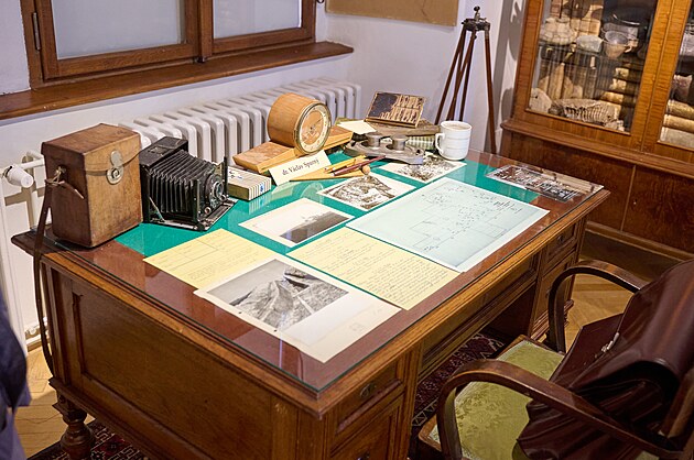 Výstava Hradisko u Kroměříže - pevnost z doby bronzové v Muzeu Kroměřížska. Na snímku - jak asi vypadal pracovní stůl archeologa Václava Spurného. (říjen 2024)