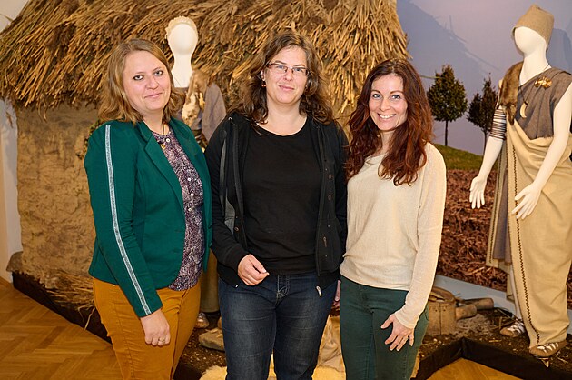 Výstava Hradisko u Kroměříže - pevnost z doby bronzové v Muzeu Kroměřížska. Na snímku kurátorky výstavy Pavlína Daňhelová, Petra Hnilová, Lenka Pělu (zleva). (říjen 2024)