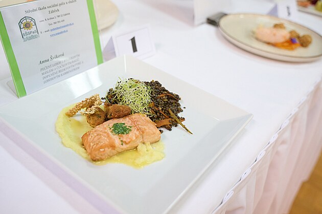 Kuchaři měli za úkol upravit lososa na dva způsoby v časovém limitu 45 minut a před zraky plného sálu. (březen 2024)