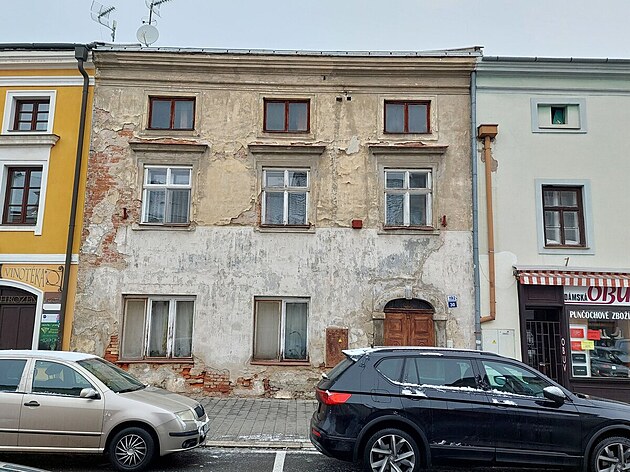 Kroměříž chce uvalit vyšší daň na budovy, které hyzdí město. Patří mezi ně i zanedbaná budova na Riegrově náměstí. (březen 2025)