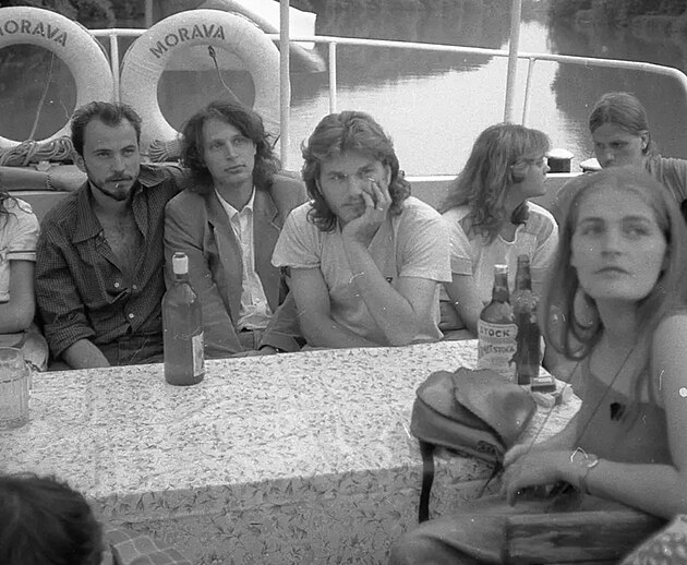 Sraz zlínských signatářů Charty 77, Leoš Duda v bílém tričku uprostřed. Vedle něj vlevo Zbyněk Baťa.