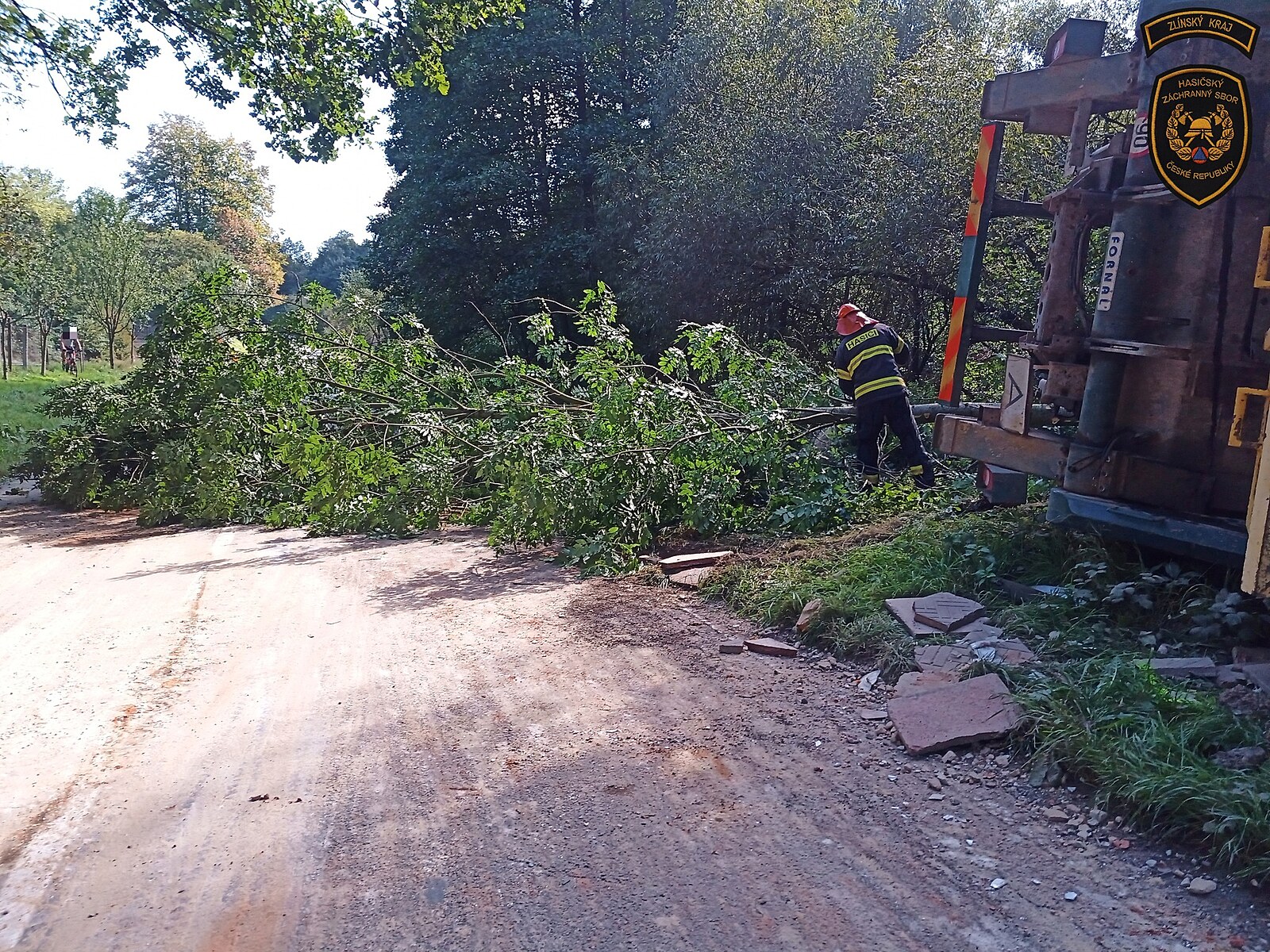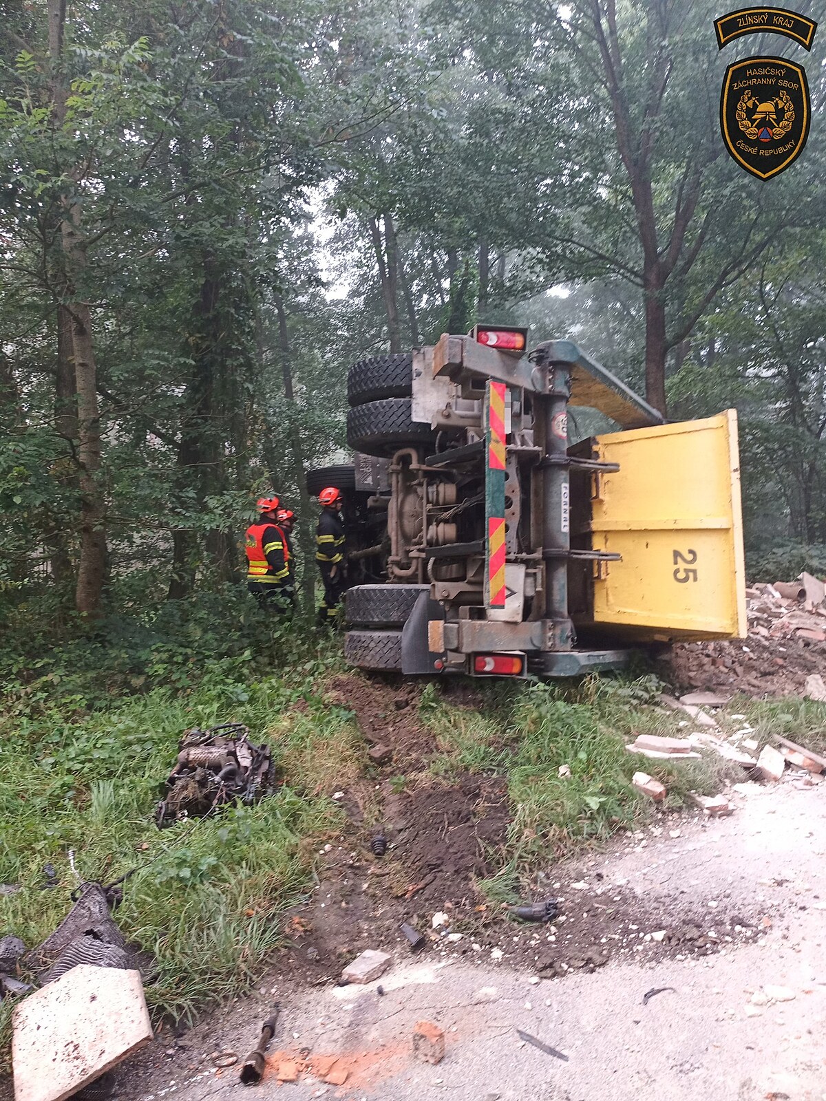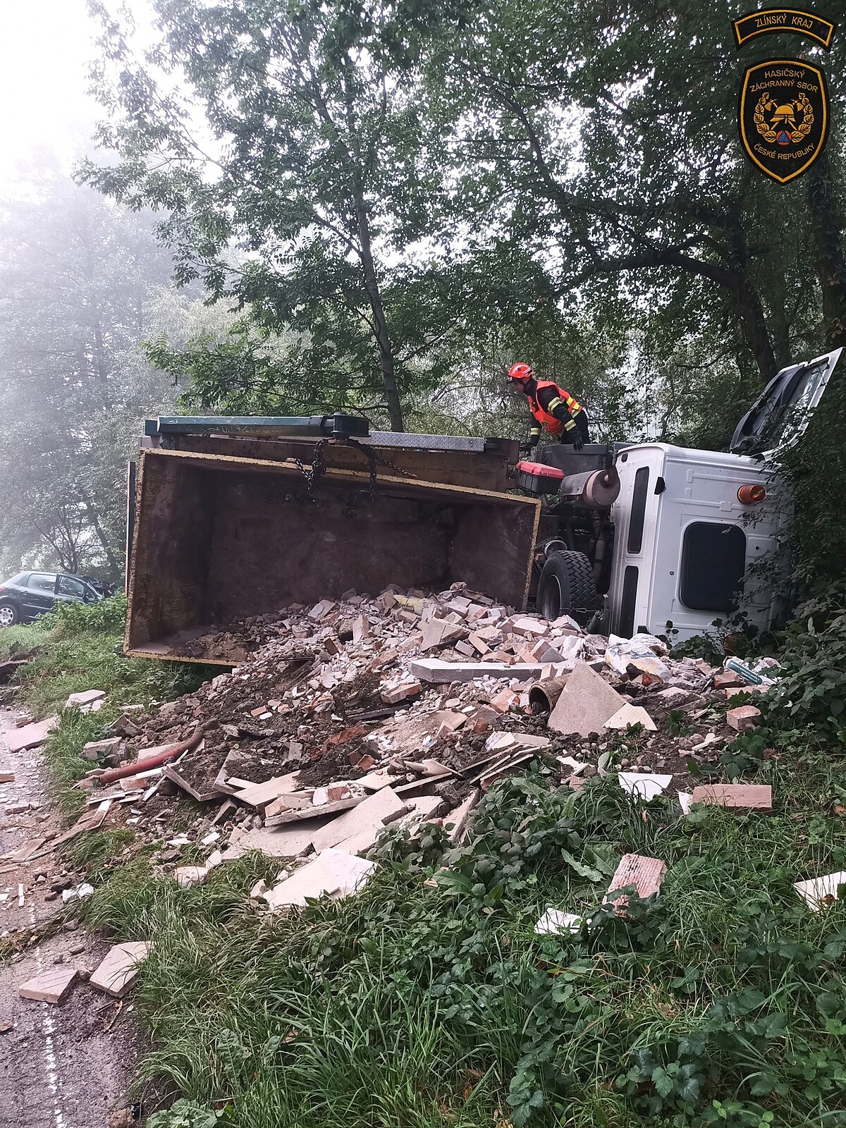 Po tragické nehodě ve Zlíně-Malenovicích skončil nákladní vůz na boku. Z korby se vysypala stavební suť.