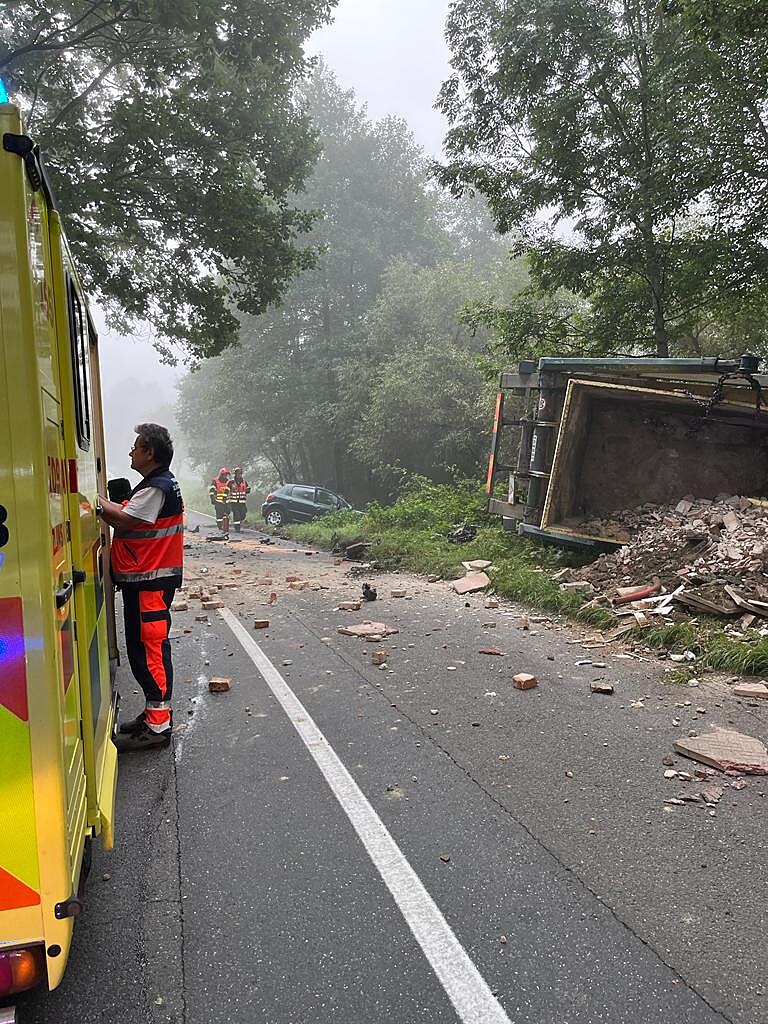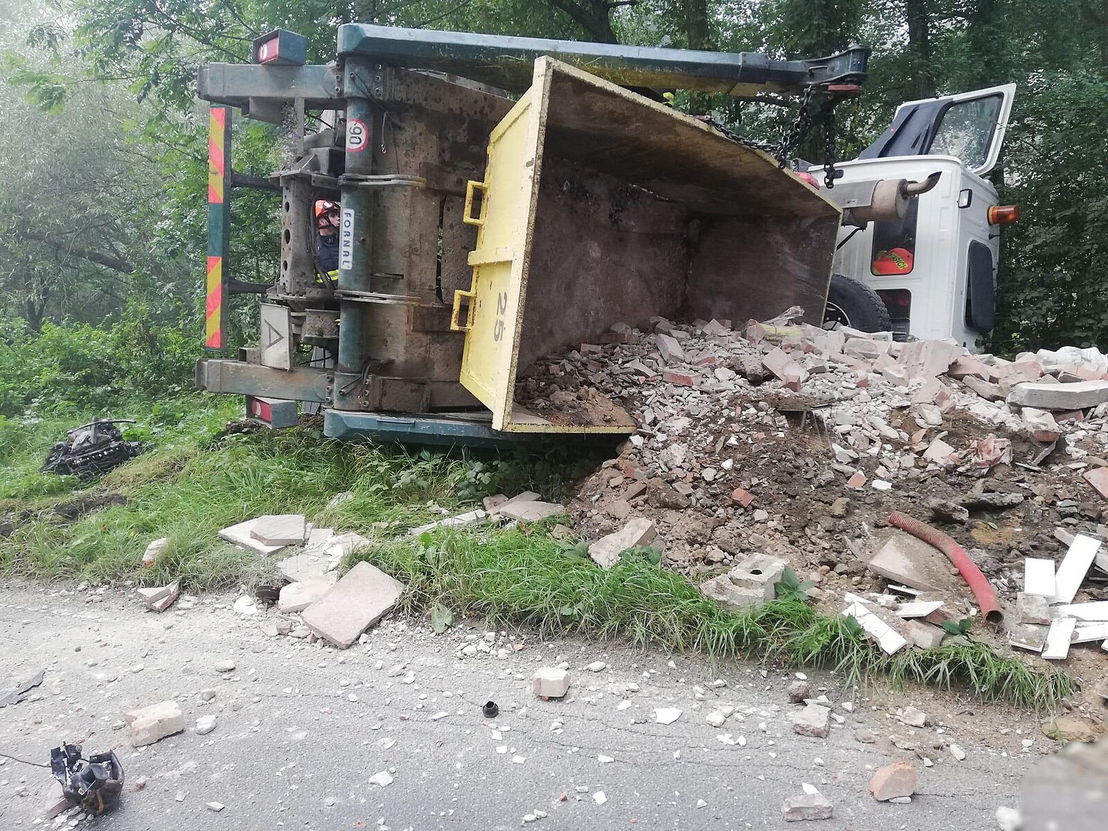 Nákladní auto převážející stavební suť skončilo po nehodě na boku. Řidič osobního auta nepřežil.