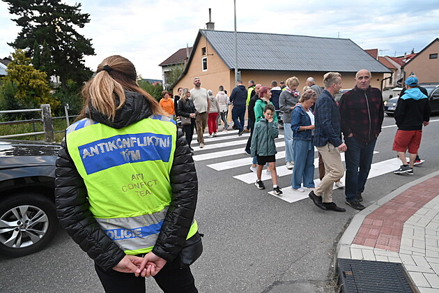 Obyvatelé Martinic blokují silnici, která obcí prochází, 25. srpna 2025, Martinice, Kroměřížsko. Chtějí tím upozornit na to, že stále nelze využívat.