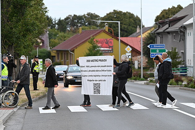 Obyvatelé Martinic blokují silnici, která obcí prochází, 25. srpna 2025, Martinice, Kroměřížsko. Chtějí tím upozornit na to, že stále nelze využívat. Starostka Horního Lapače Jaroslava Hudečková.