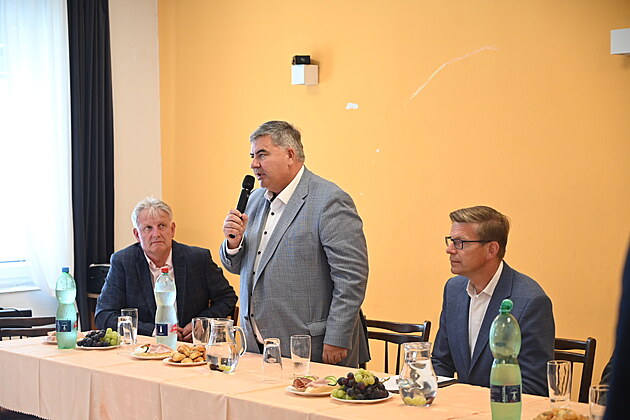 Ministr dopravy Martin Kupka (vpravo) navštívil obec Martinice, aby si vyslechl stížnosti místních obyvatel i starostů na nedostavěnou dálnici D49. Na setkání promluvil také šéf zlínského ŘSD Karel Chudárek (s mikrofonem). (8. září 2025)