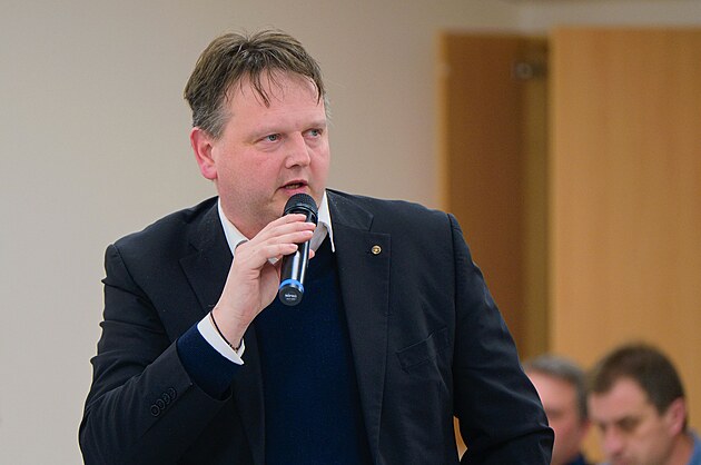 Ministr školství Mikuláš Bek se v Liptále na Vsetínsku setkal se starosty obcí, kterým se nelíbí návrh ministerstva na změnu financování nepedagogických pracovníků škol. Na snímku starosta Pitína Michal Vrba. (únor 2025)
