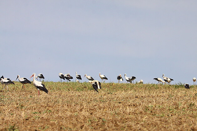 Čápi bílí táhnoucí na jih na poli u zlínské části Mladcová (srpen 2025)