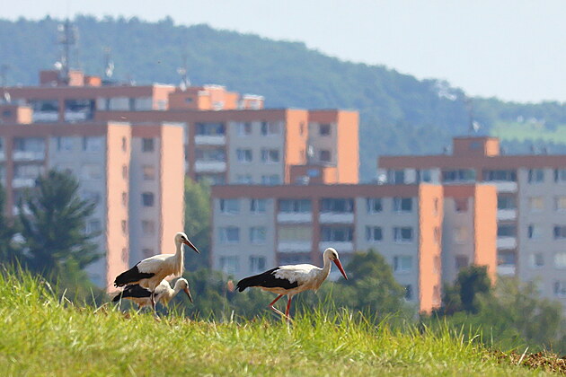 Čápi bílí táhnoucí na jih na poli u zlínské části Mladcová. (srpen 2025)