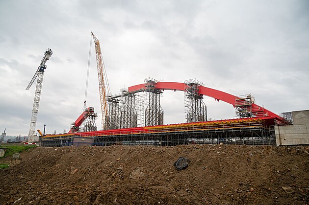 Silničáři u Napajedel dokončují impozantní oblouk mostu přes řeku Moravu. Most je součástí pokračování dálnice D55. (duben 2025)